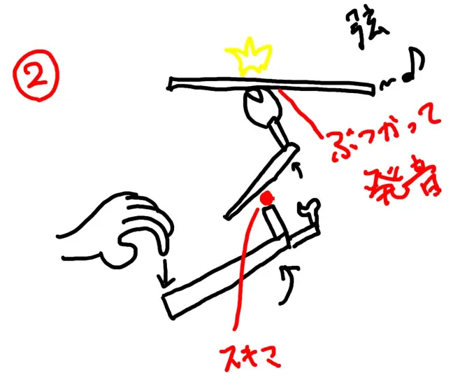 ピアノが音を鳴らすまでの、動作を私の拙い絵を使ってものすごーくざっくり解説します。